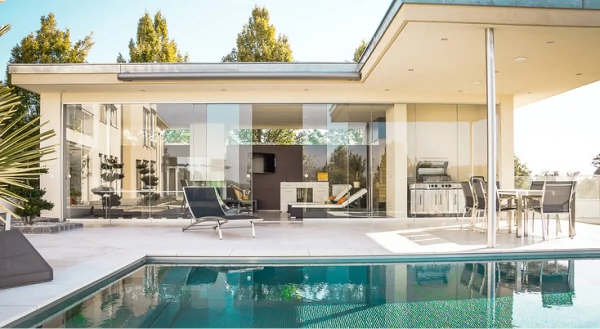 This elegant and modern home boasts sophisticated architecture and high-end finishes, including marble and wood floors.